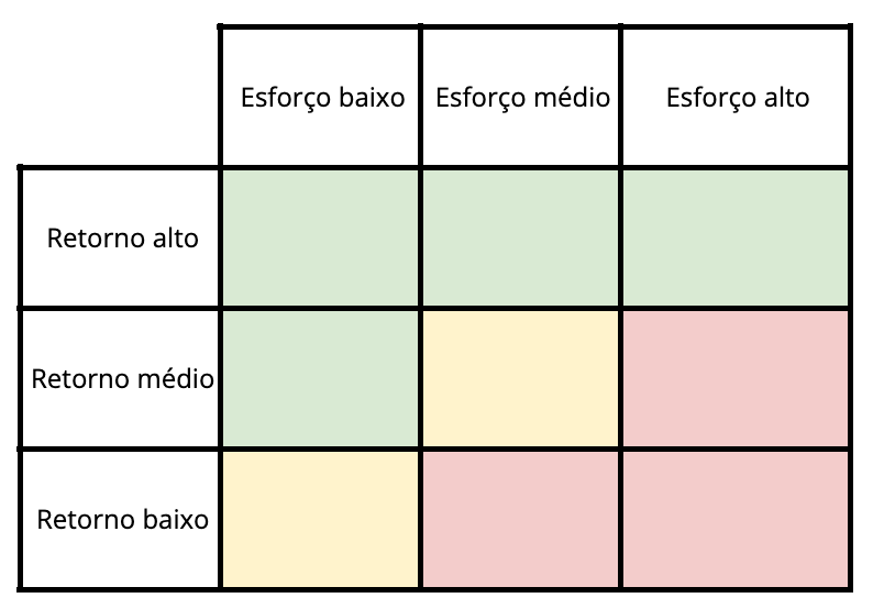 Duas iniciativas de ‘esforço médio’ consomem mais tempo e energia do que uma iniciativa de ‘esforço alto’, mas dois ‘retorno médio’ não necessariamente são maiores que um ‘retorno alto’.