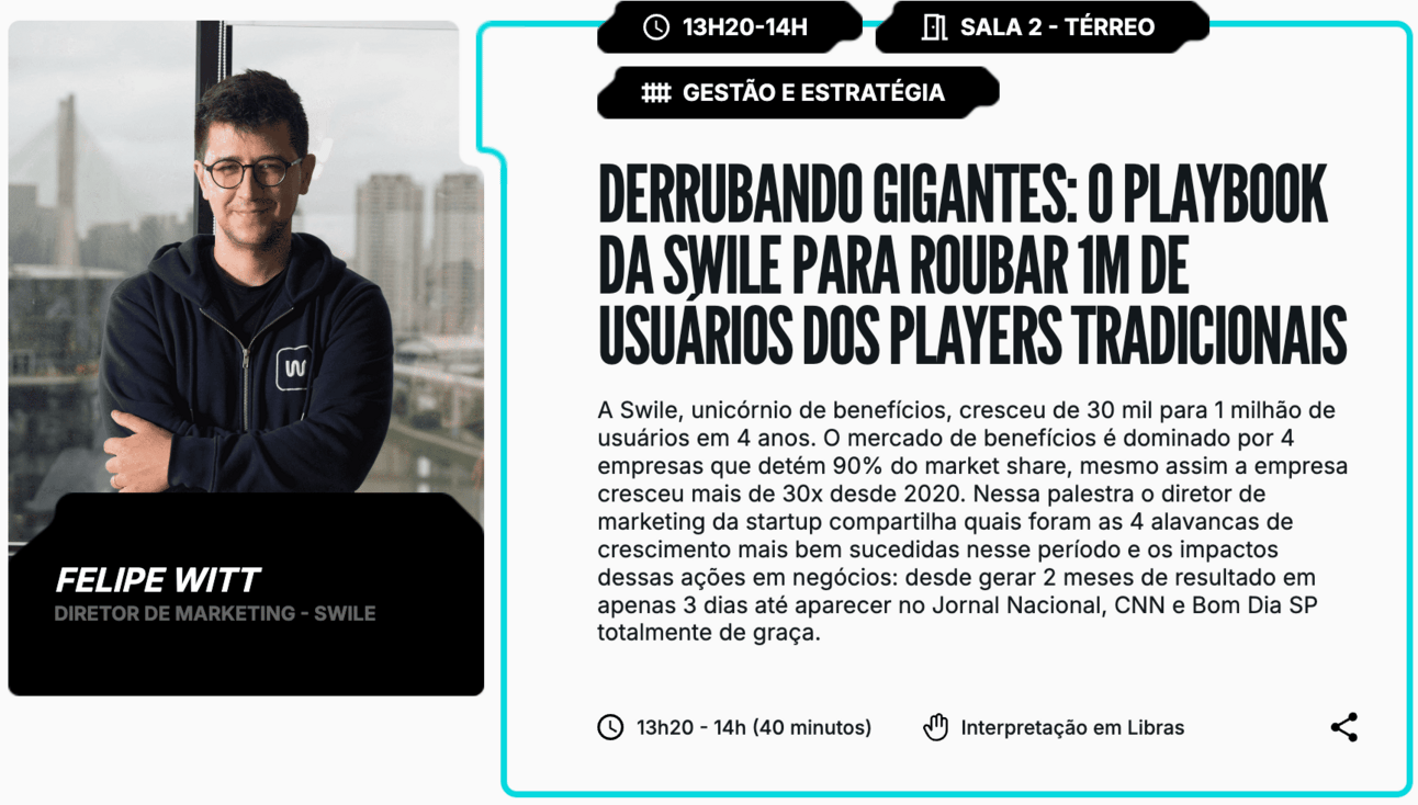 Nesta sexta-feira subo aos palcos do RD Summit para contar como a Swile cresce 30x mesmo competindo com os gigantes do setor. Por isso quero te pedir duas coisas (leva 7 segundos):
