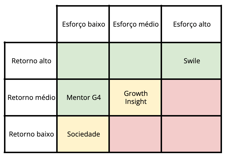 Para melhor ilustrar esse ponto eu criei uma matriz (uso totalmente pessoal, essa é a primeira vez que compartilho essa ideia fora de conversas) que cruza esforço, retorno e risco de uma iniciativa.