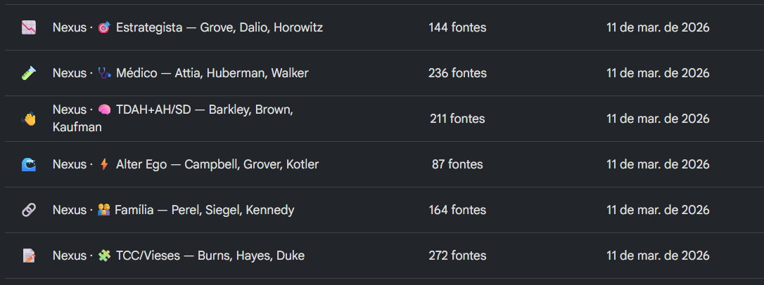 Printscreen do meu NotebookLM, com centenas de fontes por “cadeira” do Conselho. Usei o Claude Code para popular esses notebooks.