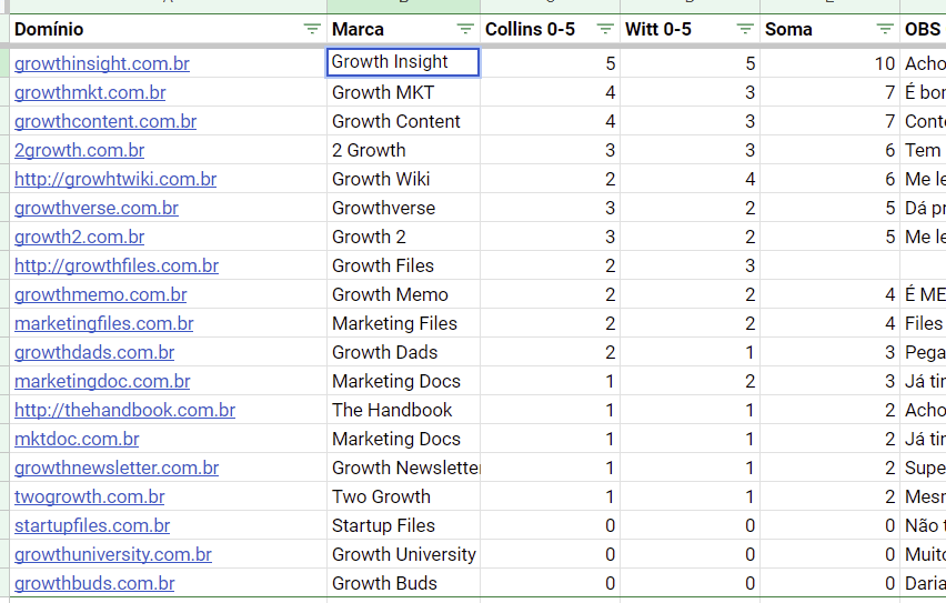 Aí, montamos essa tabela aqui, com nomes que ambos criaram. Tinha nome de “eu já tinha esse domínio antes”, tinha nome com piadinha, tinha nome com associação distante e tinha nomes bem mais diretos, como o que escolhemos