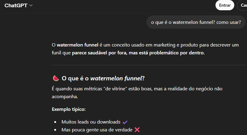 Múltiplas mensagens em grupos de WhatsApp de marketing e growth discutindo e analisando o funil como se fosse real. O “detalhe” que fecha o argumento: o Funil Melancia apareceu na busca do ChatGPT e do Microsoft Copilot indexado como se fosse de verdade.