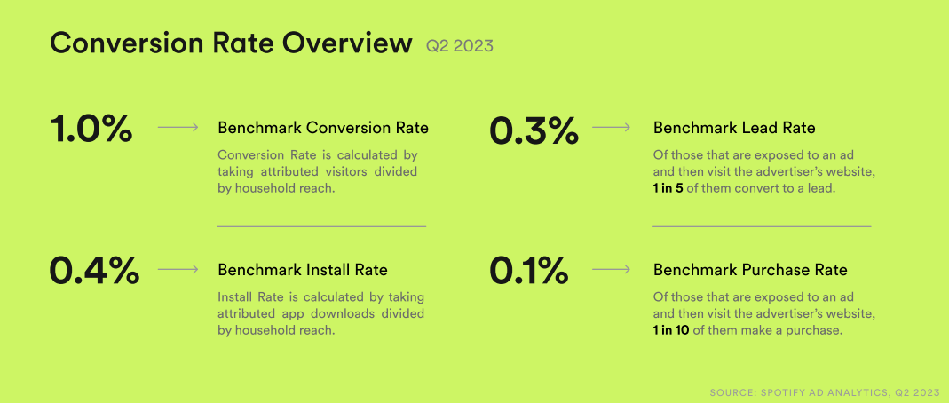 O formato de anúncios em podcasts tende a ser mais para conhecimento de marca: um report do Spotify mostra que a conversão é inferior a 1% (mas não conta a mídia “dentro” do conteúdo do episódio, então os números podem ser diferentes).